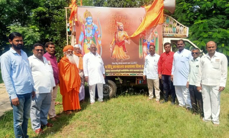 लोहारा (जि. धाराशिव): छत्रपती शिवाजी महाराज यांच्या राज्याभिषेक सोहळ्यास ३५० वर्ष पूर्ण होत असल्याने हिंदू साम्राज्य स्थापना दिन साजरा करण्यात येत आहे. त्या अनुषंगाने विश्व हिंदू परिषद, बजरंग दल यांच्या वतीने धाराशिव जिल्हाभरात कलश व रथ यात्रा काढण्यात आली आहे. दिनांक एक आक्टोबर रोजी उमरगा तालुक्यातील अचलबेट देवस्थान या ठिकाणाहून कलश व रथयात्रेस सुरूवात करण्यात आली. उमरगा तालुक्यातून या रथ यात्रेचे मंगळवारी ३ ऑक्टोंबर रोजी लोहारा शहरातील भारतमाता मंदिरात आगमन झाले. या रथ रथयात्रेचे मोठ्या उत्साहात स्वागत झाले. यावेळी मान्यवरांच्या उपस्थितीत कलशाचे पूजन करण्यात आले. छत्रपती शिवाजी महाराज यांच्या प्रतिमेचे पूजन करून अभिवादन करण्यात आले. यानंतर रथयात्रेचे उद्देश सांगताना चंदनशिवे म्हणाले की, छत्रपती शिवाजी महाराज यांच्या राज्याभिषेक सोहळ्यास ३५० वर्ष पूर्ण होत असून १६ व्या शतकातील राज्याभिषेक झालेले एकमेव हिंदू राजे होते. हिंदुसाठी गौरवास्पद इतिहास आहे. हा इतिहास पुढच्या पिढीला माहित होण्यासाठी रथयातत्रेचे अयोजन करण्यात आलेल आहे. याप्रसंगी धाराशिव जिल्हा धर्मप्रसार प्रमुख मुरलीधर कुलकर्णी, बबनगिरी महाराज उंडरगावकर, दत्तमामा सलगरे, दिनकर जावळे-पाटील, शंकर जाधव, शहाजी जाधव, यशवंत चंदनशिवे, विक्रांत संगशेट्टी, दगडू तिगाडे, प्रमोद पोतदार, कल्याण ढगे, बालाजी चव्हाण, अशोक तिगाडे, यशवंत चंदनशिवे, मनोज तिगाडे, विरेष स्वामी, युवराज जाधव, यांच्यासह नागरिक मोठ्या संख्येने उपस्थित होते.